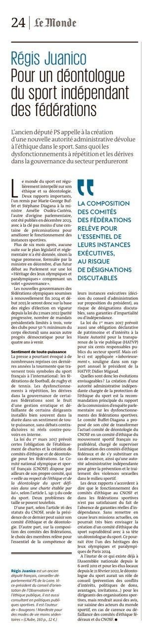 Le monde du sport est régulièrement interpellé sur les enjeux majeurs d’éthique et de déontologie. Deux rapports importants, l’un remis par Marie-George Buffet et Stéphane Diagana à la ministre Amélie Oudéa-Castéra, l’autre d’origine parlementaire, ont été publiés en décembre 2023, avec à la clé pas moins d’une centaine de préconisations pour améliorer la gouvernance, la transparence ou la vie démocratique au sein des institutions sportives.